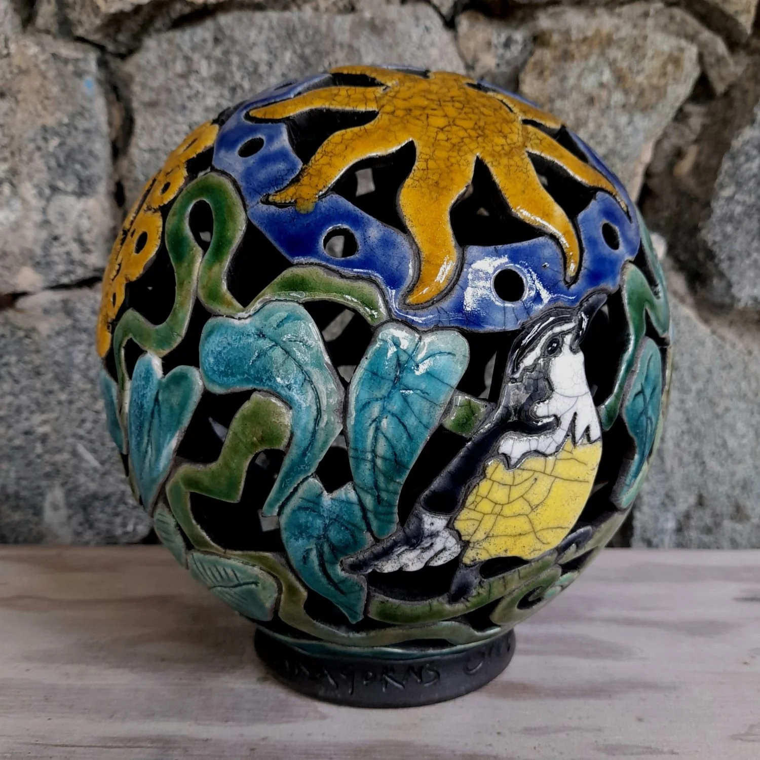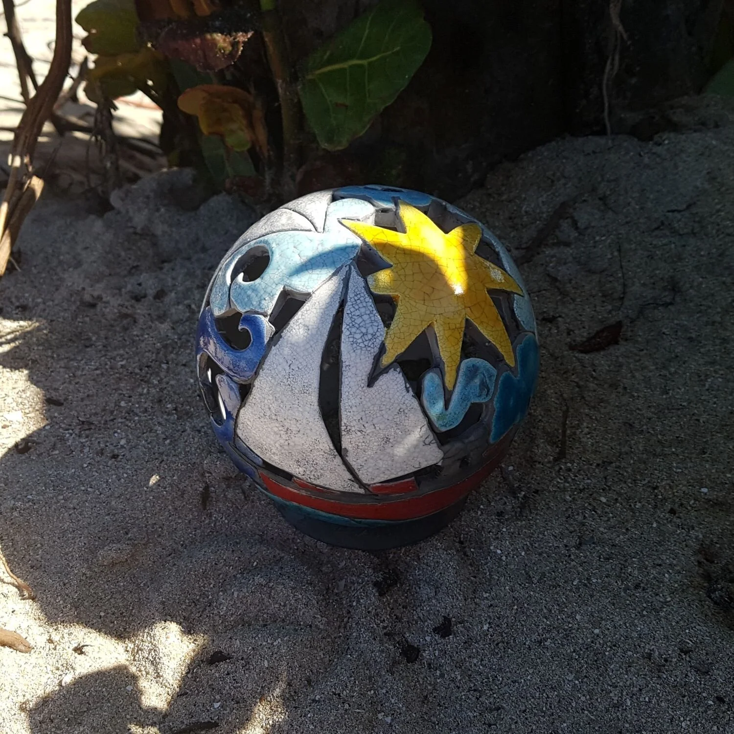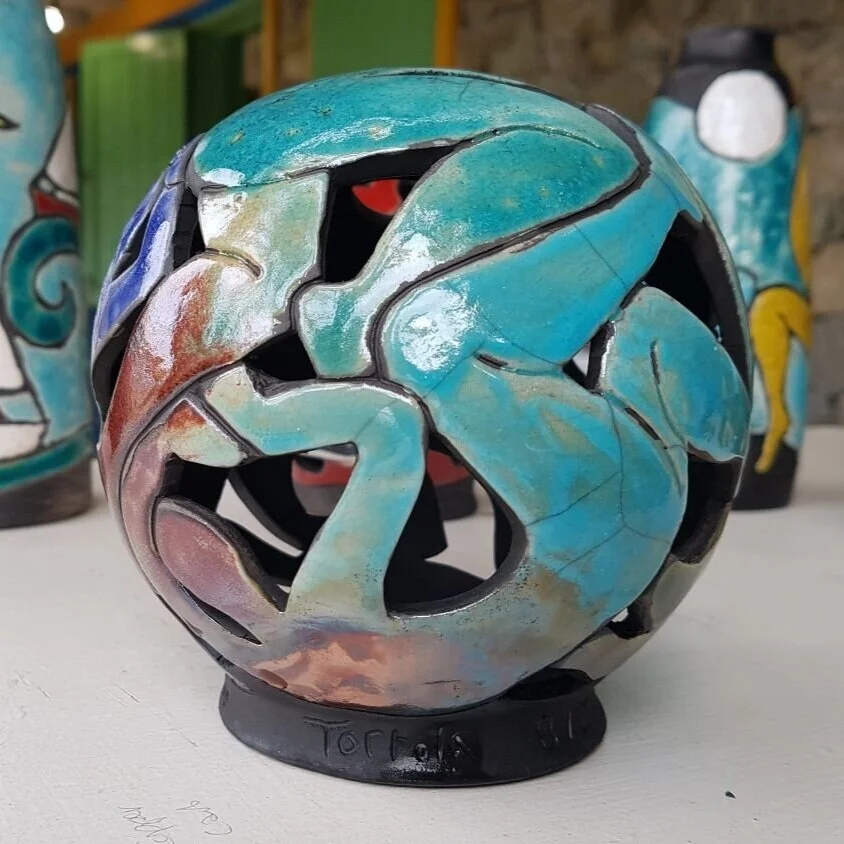 Each ceramic fireball sculpture is a small tribute to Aragorn Dick-Read’s huge steel fireball sculptures that are such a special part of Trellis Bay’s Full Moon parties. Those big guys are carved from 6-foot diameter ex-mooring balls by Aragorn and his talented team; these small ceramic versions are handmade on the potter’s wheel at TerraForma BVI exclusively for Aragorn’s Studio.